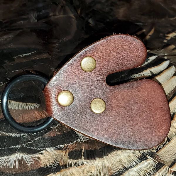 My tabs are constructed of 6 oz (2.4mm) quality hand-dyed veg-tanned leather, treated with Neetsfoot oil, and then heated mink oil. The flexible o-ring is a medium-soft durometer polymer. Left and right-hand tabs available. Other leathers available - contact me for custom orders. All finger tabs are handmade in Olympia, Washington